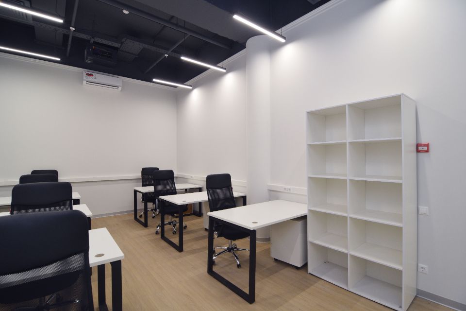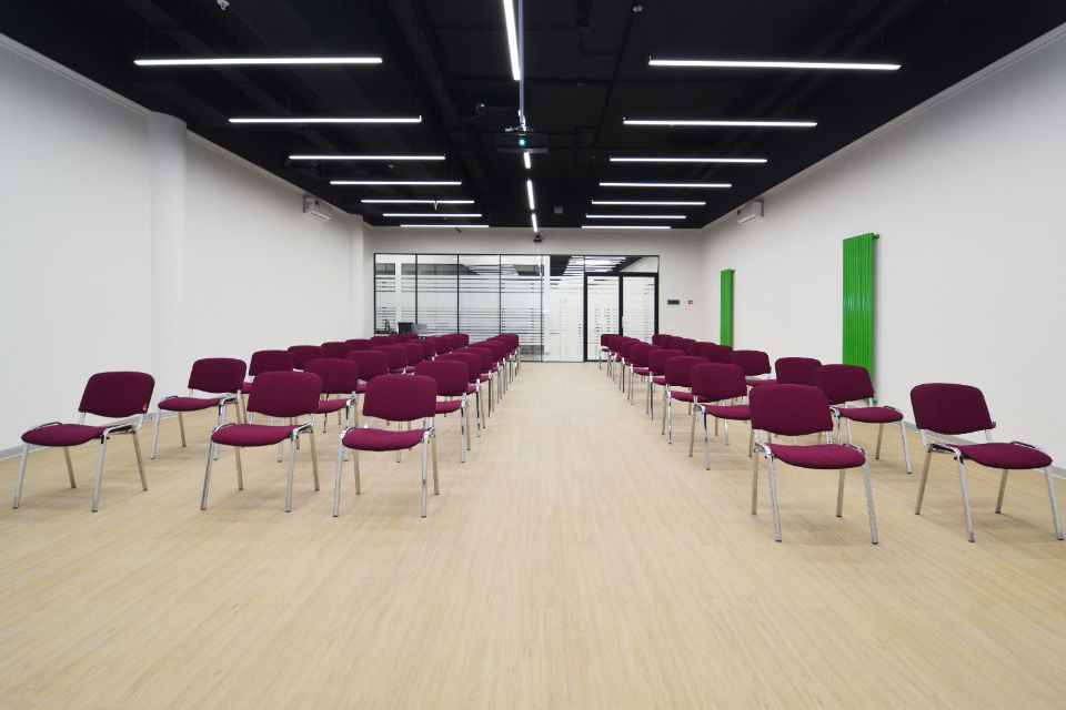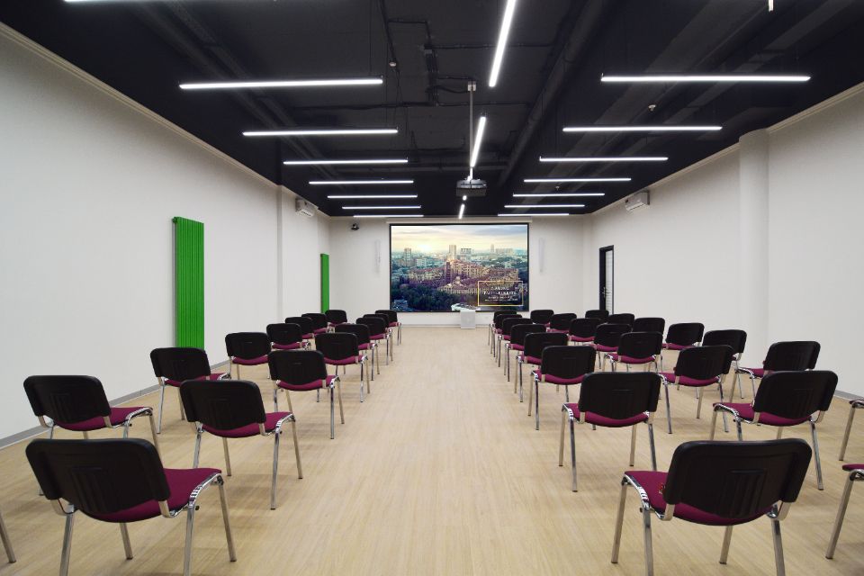 В пространстве коворкинга имеется оборудованный проектором и аудио системой конференц-зал на 70 мест для проведения мероприятий и семинаров.